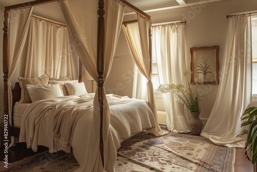 A serene bedroom with a canopy bed, soft drapes, and a plush area rug.