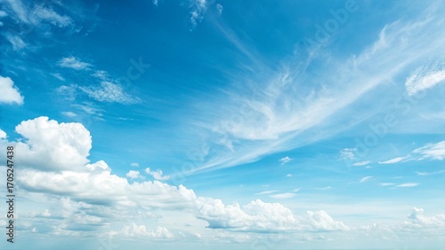 A serene blue sky filled with fluffy white clouds, creating a peaceful and calming atmosphere, perfect for backgrounds and designs