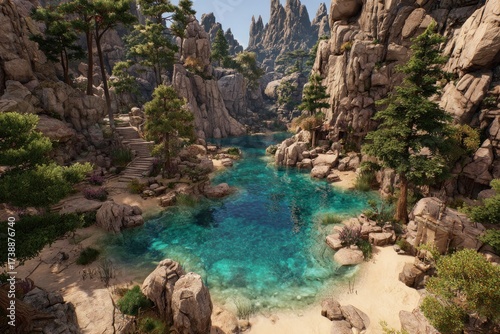 A serene canyon scene with a turquoise lake, surrounded by towering rock formations & trees