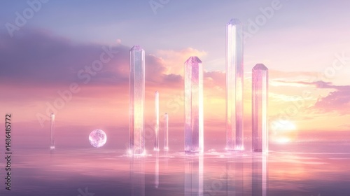 city, structure, crystalline, futuristic, serene, dawn, pastel, pink, sunrise, water, light, glowing, geometric, column, pillar, abstract, landscape, sky, cloud, peaceful, dreamlike, imagination, modern, digital, art, design, illuminated, shape, texture, fantasy, atmosphere, transparent, horizon, morning, object, soft, subtile, aethereal