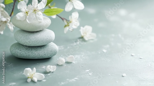 A serene composition of smooth stones and delicate flowers, evoking tranquility and harmony in a calming environment.