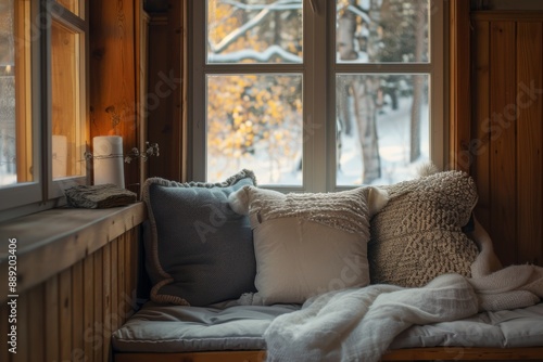 A serene corner with a comfortable window seat, adorned with soft throw pillows, perfect for relaxation. The warm lighting and inviting atmosphere make it an ideal spot to unwind.