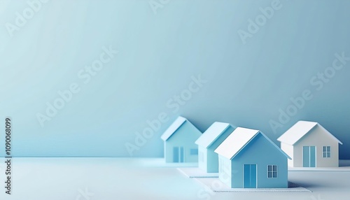 A serene depiction of minimalist blue houses on a light background, showcasing modern design and tranquility.