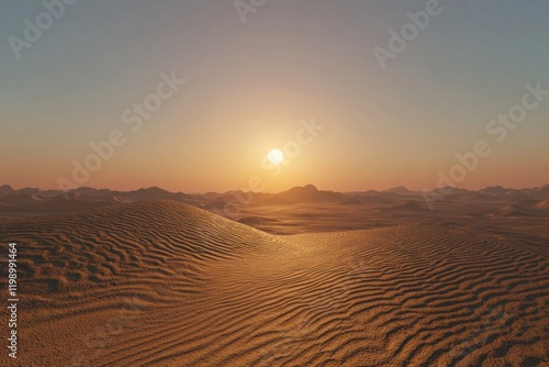 A serene desert landscape at sunset, with the sun setting behind dunes of golden sand that shimmer in the warm light. The sky is clear and calm.