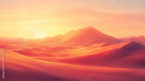 A serene desert landscape bathed in warm hues, featuring rolling sand dunes and a glowing sunset on the horizon.