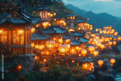 lantern, architecture, evening, light, river, traditional, serene, nature, landscape, culture, beauty, outdoors, scenery, warmth, calmness, harmony, dusk, illumination, peaceful, ambience, heritage, design, art, craftsmanship, water, mountain, foliage, garden, pathway, community, celebration, tour tourism, atmosphere, colours, shadow, visual, picturesque, scenic, charme, detail, stillness, exploration, history, tradition