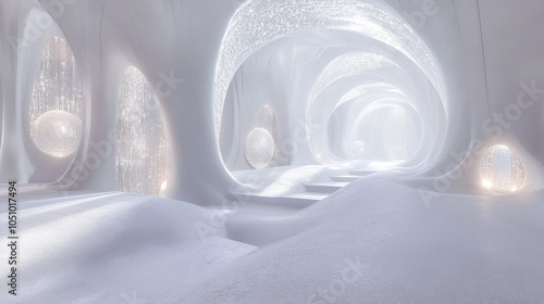 A serene, illuminated space filled with soft white textures, resembling a snow-covered environment, evoking tranquility and ethereal beauty.