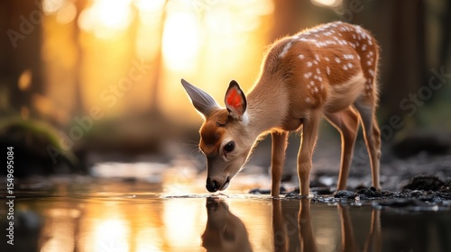A serene image of a young fawn bending down to drink from a tranquil stream, surrounded by soft golden sunlight filtering through the trees, capturing nature's beauty and innocence.