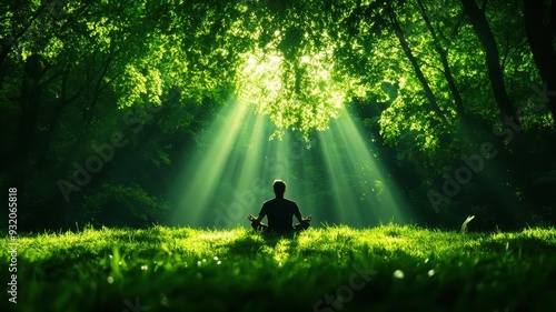 A serene individual meditates under a canopy of green trees, illuminated by soft rays of sunlight in a tranquil forest setting.
