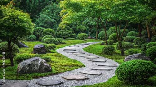 serene, japanese, zen, garden, stone, pathway, minimal, greenery, arranged, pebble