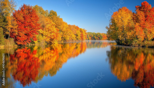A serene lake reflecting vibrant autumn foliage under a clear blue sky.