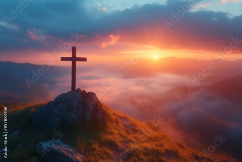 A serene landscape featuring a cross atop a rocky hill, illuminated by a vibrant sunset and surrounded by misty mountains, evoking a sense of peace and spirituality