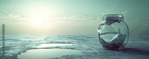 A serene landscape featuring a glass jar reflecting the tranquil surroundings.