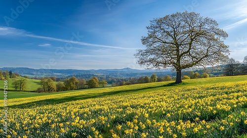 tree, daffodil, field, landscape, blue, sky, nature, spring, rural, flower, green, hill, calmness, sunlight, growth, scenery, beauty, flora, environment, park, meadow, blossom, season, peaceful, vibrant, agriculture, countryside, horizon, cloud, leisure, wildlife, earth, fresh, colours, natural, view, sunshine, relaxation, serenity, botanical, pastoral, ecosystem, lush, idylli, vegetation