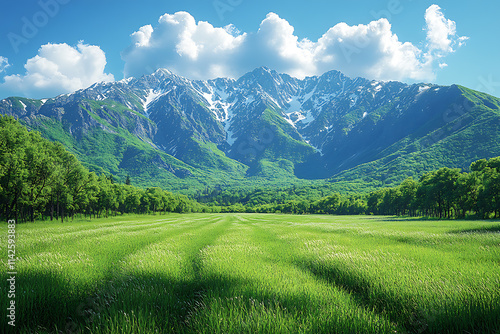 A serene landscape of wide green fields stretching towards majestic mountains in the background. The vibrant greenery contrasts beautifully with the rugged peaks, creating a tranquil and picturesque s