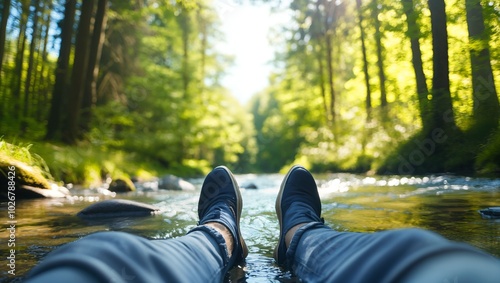 river, green, relax, serene, nature, water, calmness, foliage, outdoors, calm, summer, sunlight, adventure, peaceful, escape, shoe, foot, landscape, environment, refresh, wander, scenic, joy, harmony, explore, leisure, stillness, freshness, rejuvenation, beauty, contact, splash, movement, tree, rejuvenate, calmness, wilderness, earth, moss, rock, sunshine, vitality