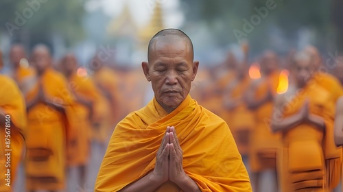 A serene monk meditating in a group, showcasing the spiritual tranquility in Thailand.