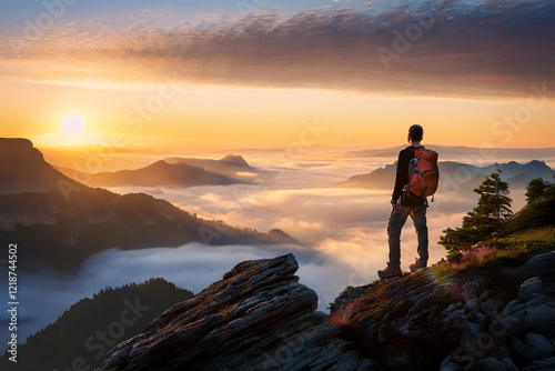 mountain, landscape, sunrise, serene, hiker, nature, hiking, trekking, scenic view, peaceful, solitude, wilderness, exploration, morning light, panoramic view, person, people, 1, traveler, wanderlust, mist, calmness, mountain peak, inspiring, foggy, golden hour, freedom, scenic beauty, wanderer