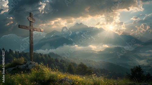 mountain, cross, sunrise, sunset, landscape, serenity, nature, cloud, flower, forest, dramatic, scenic, peaceful, spirituality, travel, religious, rural, exploration, calmness, summer, greenery, breathtaking, rock, mist, sky, sunlight, hill, symbolic, faith, inspiration, beauty, picturesque, vibrant, alpine, natural, environment, wilderness, view, photo