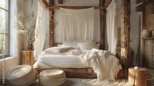 A serene scene of a rustic bedroom with a canopy bed made from reclaimed wood, soft linen bedding, and bedside tables crafted from tree trunks, high detail