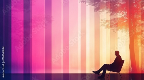 A serene silhouette sits in a vibrant, colorful landscape, blending natural elements with abstract vertical lines, evoking a sense of calm and contemplation.