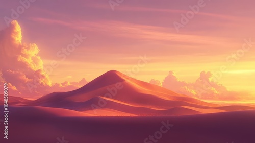A serene sky at golden hour over a desert, with soft pink and orange hues lighting up the dunes under a peaceful atmosphere