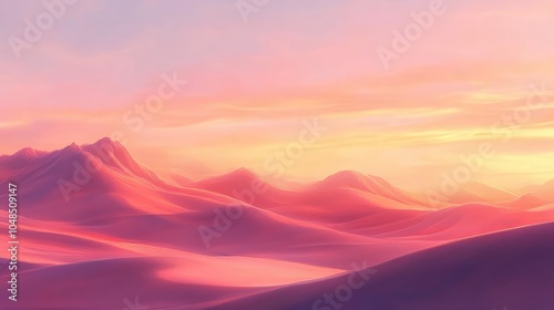 A serene sky at golden hour over a desert, with soft pink and orange hues lighting up the dunes under a peaceful atmosphere