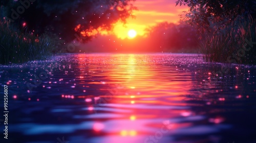 A serene sunset reflecting on a tranquil river with vibrant colors.