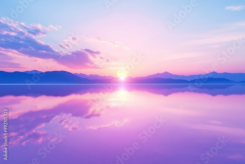 A serene view of mirror-like salt flats reflecting a colorful sunset with soft pink and purple hues, scattered clouds, and distant mountains