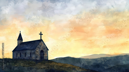 A serene watercolor of an old stone church on a hill at sunset, with a cross silhouetted against the sky and rolling hills in the distance, evoking peace and spiritual reflection.