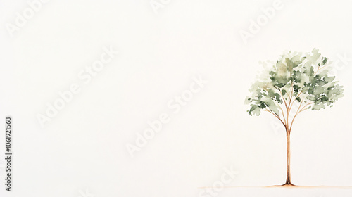 serene, watercolor, painting, single, tree, highlighted, on, pristine, white, background, the, rich, green, leaf, are, applied, in, soft, blending, into, branch, trunk, is, warm, brown, hue, with, subtile, shading, capturing, an, elegant, simplicity, nature