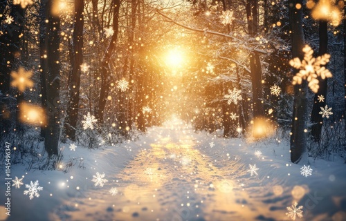 A serene winter landscape with sunlight filtering through snow-covered trees.