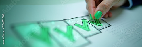 A series of green holographic checkmarks being marked off in sequence, signifying task completion against a minimalistic background with ample copy space.