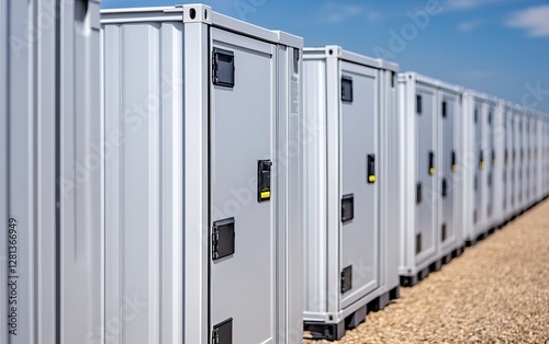 A series of grey storage containers arranged neatly in a row under a clear blue sky, showcasing a modern and organized outdoor storage solution.