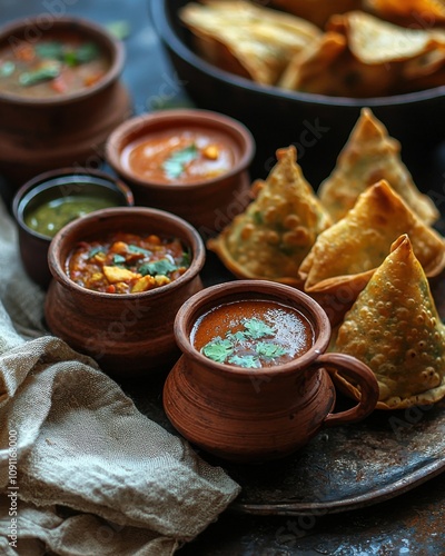 A serving of masala chai in clay cups, accompanied by crispy samosas and chutneys on a textured cloth backdrop" cozy, authentic