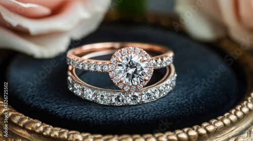 A set of matching diamond wedding bands and an engagement ring on a velvet tray