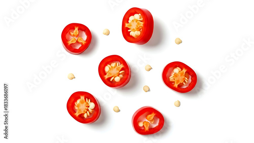 A set of neatly scattered red chili slices captured in high detail on a white background. Ideal for recipes, food blogs, product packaging, and spicy ingredient concepts.