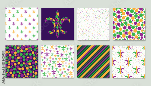 A set of seamless patterns with Mardi Gras carnival symbols.