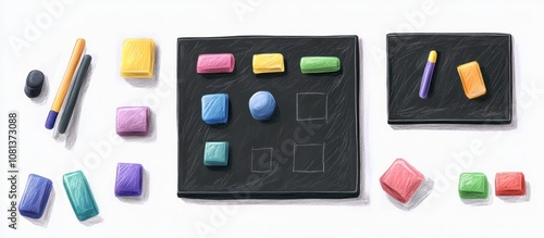 A set of traditional black chalkboards with colorful chalk pieces and erasers,