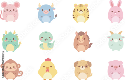 A set of twelve cute, cartoon-style animals representing the Chinese zodiac signs. The animals are designed in a soft, pastel color palette. Each animal features simple, friendly facial expressions