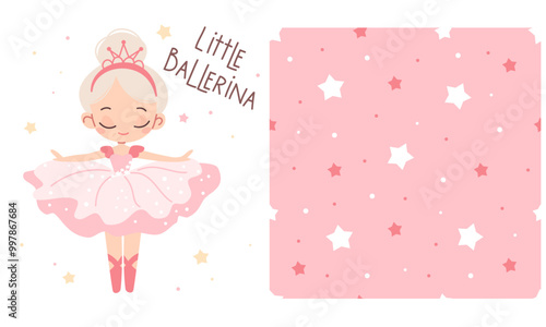 A set of vector prints for printing on children's products. Cute little girl ballerina dancing, little ballerina lettering, seamless vector pattern with stars on pink background . Vector illustration