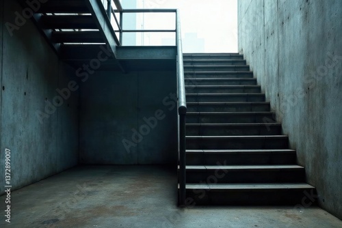 A shadowed concrete stairway ascends towards a bright, undefined space, featuring a metal handrail and an elevated landing