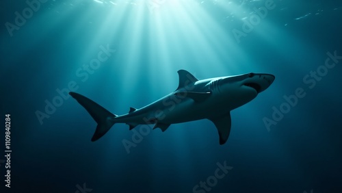 A shark gliding through the open ocean, conveying its strength and grace in the vast expanse of the sea.