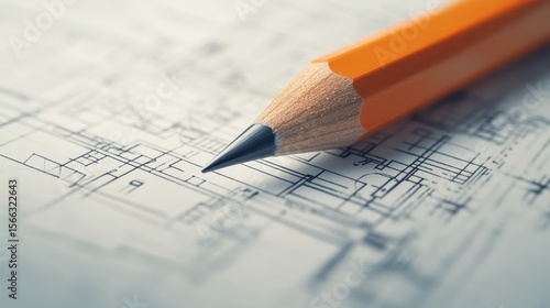 A sharpened orange pencil rests on a detailed architectural blueprint, symbolizing design and drafting processes.
