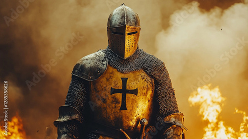 A shining medieval knight in polished armor stands ready for battle, symbolizing bravery, honor, and heroism. The warrior embodies ancient chivalry and modern fantasy adventure