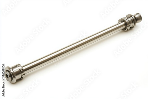 A shiny metal rod with end attachments on a white background in a studio setting for product shot transparent background