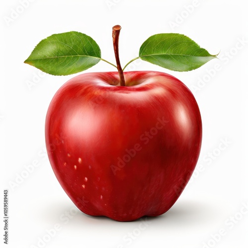 A shiny red apple with green leaves, symbolizing freshness and health.