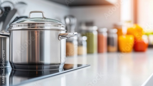 A shiny stainless steel pot sits on a modern kitchen stovetop with colorful jars in the background.