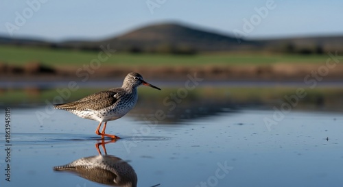 bird, water, shore bird, wetland, nature, wildlife, outdoors, avian, beak, orange, leg, mottled, feather, habitat, shallow, serene, landscape, field, hill, background, blurry, sharpened, calm, environment, morning, light, sunny, sky, clear, detail, closeup, portrait, elegant, standing, observing, speckled, natural, beauty, tranquil, delicate, peaceful, alive, vibrant, ecosystem, scene, perspective, foreground, horizon