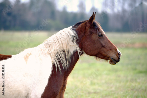 A side view of a brown and white horse.